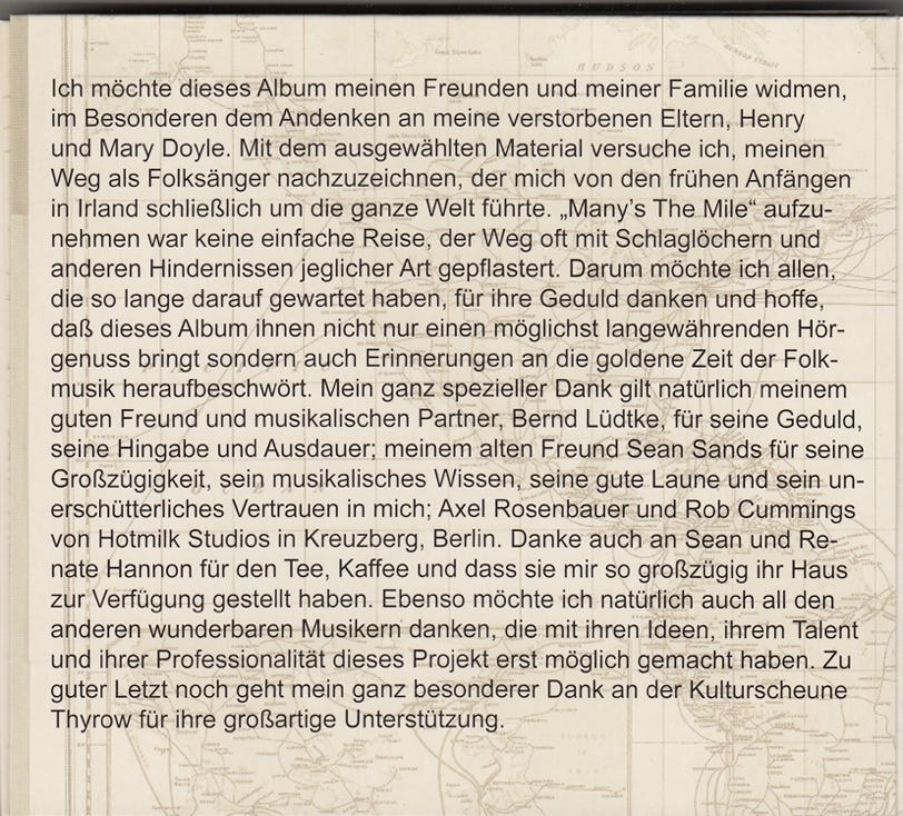 Robbie und sein alter Freund, der mittlerweile verstorbene irische Dudelsackspieler Johnny Murray, hatten die Gelegenheit, an diesem Album von Reinhard Mey aktiv mitzuwirken. Robbie Doyle dazu: „Wir haben wirklich sehr hart daran gearbeitet, um für die Studio-aufnahmen gut vorbereitet zu sein – und glücklicherweise lief dann am Ende auch alles ganz hervorragend.“ Es lief sogar so hervorragend, daß Robbie noch ein weiteres Mal zu Studioaufnahmen eingeladen wurde, und kurz nach diesen Aufnahmen gab Robbie mit Reinhard Mey ein Konzert in der Berliner Deutschlandhalle.